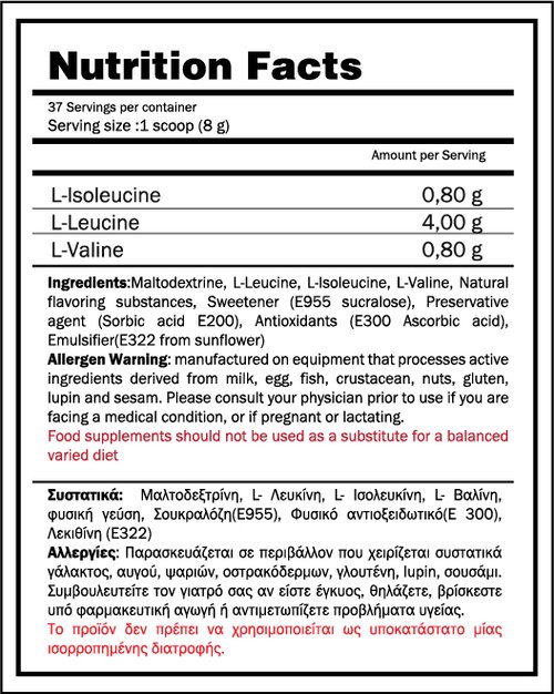 Χρήση: Εάν λαμβάνονται πριν από την προπόνησή σας, τα BCAA συμβάλλουν στην αποτροπή της διάσπασης της πρωτεΐνης των μυών κατά την άσκηση, ενώ αν καταναλώνονται το συντομότερο δυνατό μετά την άσκηση, αυξάνουν τη σύνθεση πρωτεΐνης και μεγιστοποιούν τα αποτελέσματα της προπόνησης