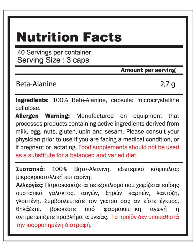 Σημείωση: Η β-αλανίνη στα περισσότερα άτομα μπορεί να προκαλέσει μια αίσθηση μούδιασματος ή μυρμήγκιασμα στο δέρμα. Αυτή είναι μια απόλυτα φυσιολογική επίδραση στο σώμα και δεν ειναι επιβλαβής.