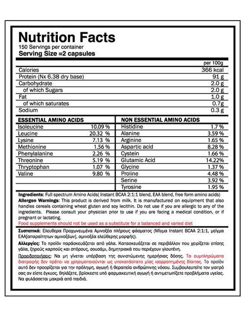 Το Full Spectrum AMINO περιέχει και τα 18 απαραίτητα και μη απαραίτητα αμινοξέα, για να υποστηρίξει τις ανάγκες του σώματος σας. Μια προσεκτικά μελετημένη αναλογία αμινοξέων σε vegan κάψουλες που αποροφούνται γρήγορα από τον οργανισμό και διοχετεύονται άμεσα στους μύες σας. Έχει ιδιαίτερα μεγάλη περιεκτικότητα σε BCAA τα οποία είναι πολύ σημαντικά για τη διέγερση της διαδικασίας της πρωτεϊνοσύνθεσης, αλλά και για την ανάπτυξη και την αναγέννηση των μυών. Επομένως είτε είστε αθλητής που χρειάζεστε muscle gains, είτε απλά θέλετε συνολική ευεξία, το Full Spectrum Amino, μπορεί να υποστηρίξει διατροφικά τις ανάγκες του οργανισμού σας για αμινοξέα.