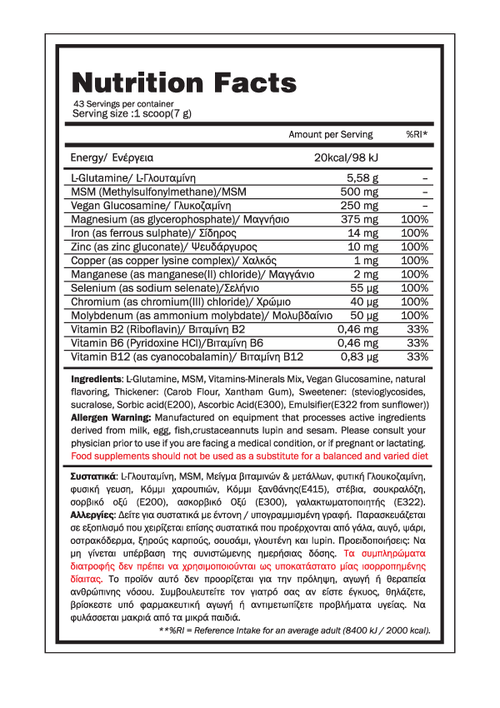 • 5,57g L-Γλουταμίνης, για αποκατάσταση μυών & μείωση της καταπόνησης απο την προπόνηση