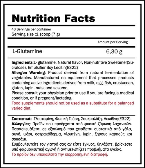 Χρήση: Ιδανικά πρέπει να καταναλώνετε την γλουταμίνη αμέσως μετά την προπόνηση σας και πριν πάτε για ύπνο το βράδυ. (Δεδομένου ότι το σώμα σας μπαίνει σε ανάρρωση κατά τη διάρκεια του ύπνου, η επιπλέον γλουταμίνη θα βοηθήσει για πιο γρήγορη ανάκαμψη.)