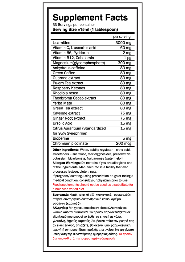 Συστατικά όπως το πράσινο τσάι το οποίο υποστηρίζει αντιοξειδωτικά τον οργανισμό και αποδεδειγμένα υποστηρίζει την λιποδιάλυση. Το πιπέρι καγιέν το οποίο περιορίζει την όρεξη για φαγητό, επιταχύνει το μεταβολισμό και βοηθά να κάψετε επιπλέον θερμίδες. Το Ginseng το οποίο βελτιώνει τη συγκέντρωση και την αντοχή κατά τη διάρκεια της προπόνησης και σε συνδυασμό με το Guarana μπορεί να ενισχύσει την επίδοση σας. Rasberry Ketones που περιέχουν την ουσία αδιπονεκτίνη, η οποία συμμετέχει σε πλήθος μεταβολικών διεργασιών και ιδιαίτερα τον μεταβολισμό του λίπους και της γλυκόζης. Εκχύλισμα Rhodiola rosea, η οποία βελτιώνει τη διάθεση & την αντίδραση του οργανισμού στο στρες με αποτέλεσμα να καθιστά το σώμα πιο ανθεκτικό στην κούραση λόγω της έντονης άσκησης, βελτιώνοντας με τον τρόπο αυτό την σωματική απόδοση. Το Ginger το οποίο έχει λιποδιαλυτικη δράση ενώ επίσης βεβαιώνει ότι δεν χάνετε απλώς βάρος ή υγρά αλλά λίπος.