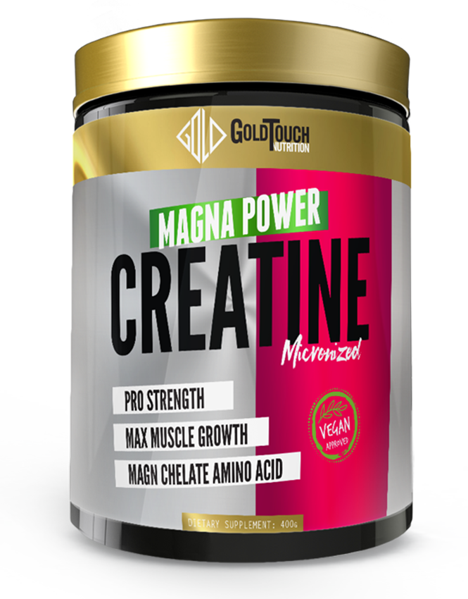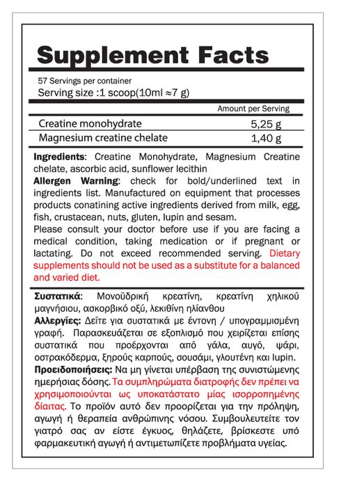 & κρεατίνη χηλικού μαγνήσιου η οποία είναι ένας συνδυασμός Μονοϋδρικής Κρεατίνης και Μαγνησίου σχεδιασμένος ώστε να αυξάνει τη σωματική απόδοση. Το μαγνήσιο συμβάλλει αποτελεσματικά στη φυσιολογική μυϊκή λειτουργία και στη φυσιολογική σύνθεση της πρωτεΐνης