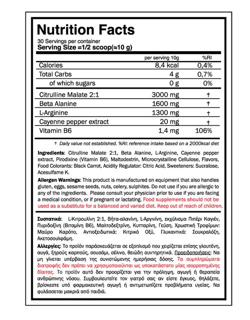 Βελτιστοποιημένη ροή αίματος: Η L-Αργινίνη & η Citrulline Malate  αυξάνουν την παραγωγή Νιτρικού οξειδίου και προκαλούν αγγειοδιαστολή. Η βελτιωμένη ροή οξυγόνου & θρεπτικών συστατικών μέσω του αίματος, όχι μόνο βοηθά στην καλύτερη απόδοση αλλά συμβάλλει επίσης σε μια πιο αποτελεσματική αποκατάσταση μετά την προπόνηση.
