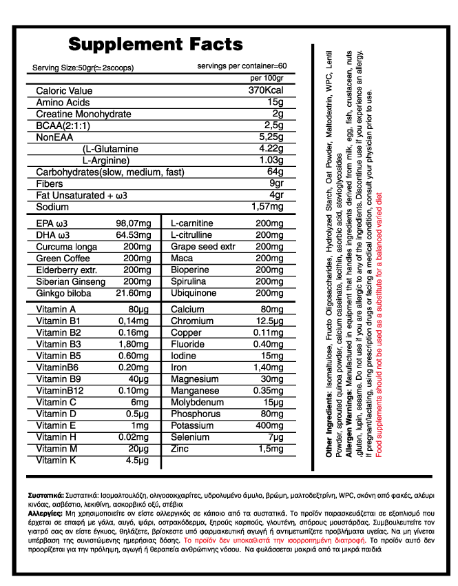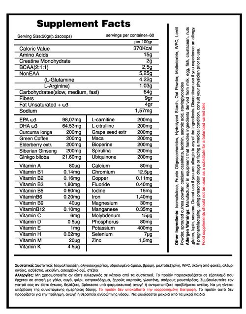 Πιο συγκεκριμένα παρέχει στο σώμα σας έναν μοναδικό συνδυασμό κρεατίνης, αμινοξέων BCAA, γλουταμίνης, υδατανθράκων, ωμέγα 3 λιπαρών οξέων, βιταμινών, μετάλλων και άλλων παραγόντων που απαιτούνται για μυϊκή ανάπτυξη, δύναμη και ανάρρωση σε περιόδους σκληρής προπόνησης.