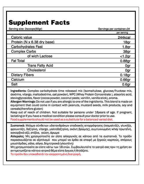 Δηλαδή αποτελείται από ένα σύμπλεγμα σύνθετων υδατανθράκων που απορροφώνται με διαφορετικούς ρυθμούς με αποτέλεσμα να απελευθερώνουν σταδιακά την ενέργεια που χρειάζεται το σώμα σας για να τροφοδοτήσει τις προπονήσεις σας, ενώ επίσης αναπληρώνει τα αποθέματα γλυκογόνου. Επιπλέον εξασφαλίζεται η διατήρηση της ινσουλίνης σε υψηλό επίπεδο, ενισχύοντας έτσι την αναβολική της δράση καθώς και πρωτεΐνη υψηλής διατροφικής αξίας και με λιγότερη ζάχαρη χοληστερίνη και σχεδόν μηδενικά κορεσμένα λιπαρά .