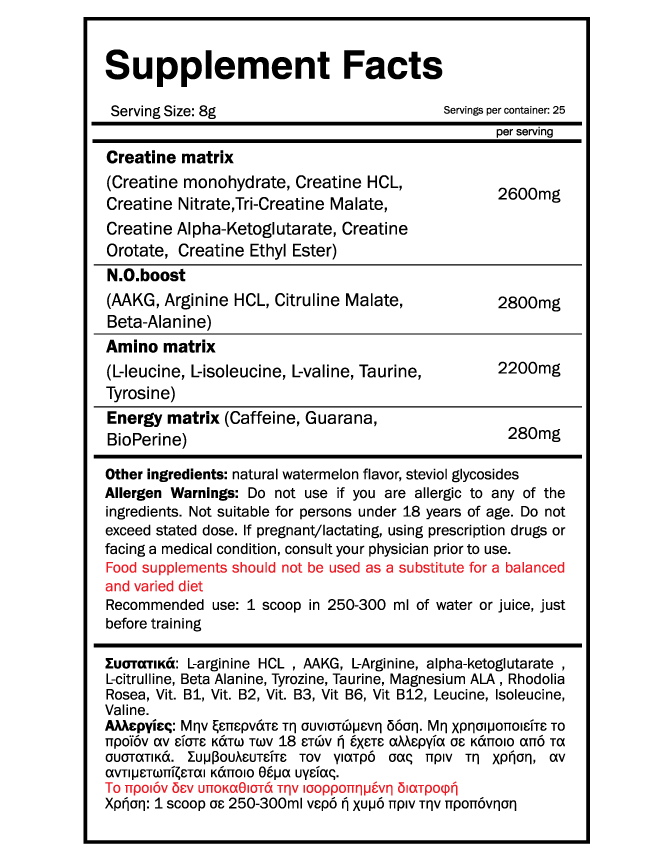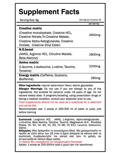 Δοσολογία: 1 scoop(8γρ) 30 λεπτά πρίν την προπόνηση