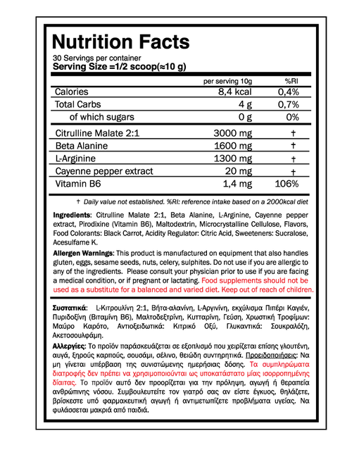 Βελτιστοποιημένη ροή αίματος: Η L-Αργινίνη & η Citrulline Malate αυξάνουν την παραγωγή Νιτρικού οξειδίου και προκαλούν αγγειοδιαστολή. Η βελτιωμένη ροή οξυγόνου & θρεπτικών συστατικών μέσω του αίματος, όχι μόνο βοηθά στην καλύτερη απόδοση αλλά συμβάλλει επίσης σε μια πιο αποτελεσματική αποκατάσταση μετά την προπόνηση.