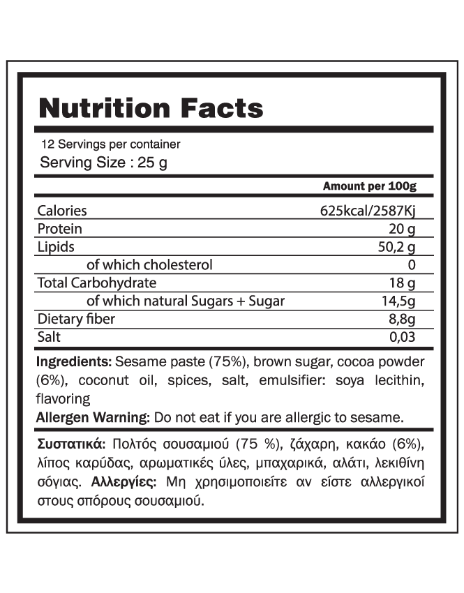 Το "ταχίνι τα σπάει" είναι ένας διατροφικός θησαυρός, μια υπερτροφή που συνδυάζει πλήθος θρεπτικών συστατικών. Περιέχει 20% πρωτεΐνη, ενώ κάθε μερίδα(25 γραμμαρίων) σας παρέχει το 80% των καθημερινών σας αναγκών σε θειαμίνη, το 24% του μαγνησίου, 50% του σιδήρου και 43% του ασβεστίου.