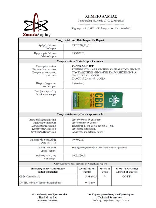 Αυτή η μέθοδος διασφαλίζει τη βέλτιστη ποιότητα παραγόμενου εκχυλίσματος πλήρους φάσματος με την μέγιστη απορροφητικότητα από τον ανθρώπινο οργανισμό. Διατηρούνται όλα τα οφέλιμα χαρακτηριστικά της Κάνναβης με όλα τα ευεργετικά συστατικά του πλήρους κανναβινοειδούς προφίλ. Η περιεκτικότητα σε Κανναβιδιόλη είναι 5%, και το εκχύλισμα είναι πλούσιο σε φυσικά τερπένια που θωρακίζουν το ανοσοποιητικό σύστημα, καθώς και σε φλαβονοειδή, φαινόλες, βιταμίνες και χλωροφύλλη. Είναι φυσικό προϊόν, πολύ χαμηλό σε THC < 0,20%.