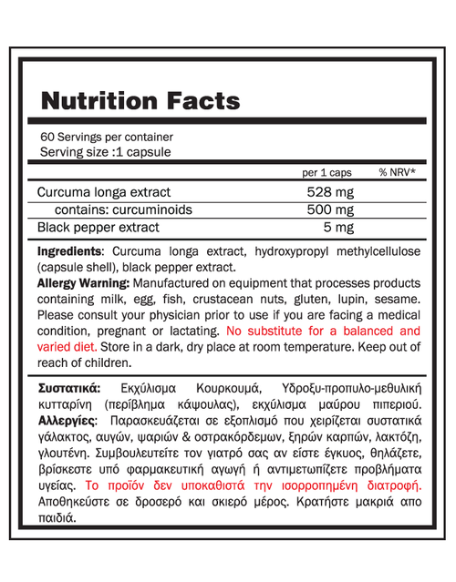 Το συμπλήρωμα Curcuma 500, περιέχει 500 mg του τυποποιημένου και κλινικά αποδεδειγμένου ειδικού εκχυλίσματος Curcumin C3 Complex® σε συνδυασμό με πιπερίνη (BioPerine®), η οποία εξασφαλίζει μέγιστη απορρόφηση και βιοδιαθεσιμότητα της δραστικης ουσίας κουκουμίνη (έως και 2000% καλύτερη απορρόφηση).