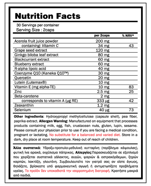 Το EYE COMPLEX είναι μια σύνθεση φυσικών αντιοξειδωτικών και μικρό-θρεπτικών συστατικών η οποία προστατεύει τα μάτια σας. Συνίσταται ιδιαίτερα, αν καταπονείται τα μάτια σας λόγω πολύωρης εργασίας στον υπολογιστή, ή ανάγνωσης, όπως και σε περίπτωση αυξημένης έκθεσης στον ήλιο.
