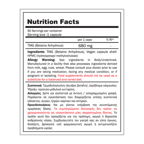 H TMG (Τριμεθυλογλυκίνη), γνωστή και ως Betaine Anhydrous, είναι ένα μόριο που παράγεται από το αμινοξύ γλυκίνη και βρίσκεται φυσικά σε τρόφιμα όπως τα παντζάρια, το σπανάκι και τα δημητριακά ολικής άλεσης και χρησιμεύει ως δότης μεθυλίου σε βασικές βιοχημικές διεργασίες του οργανισμού.