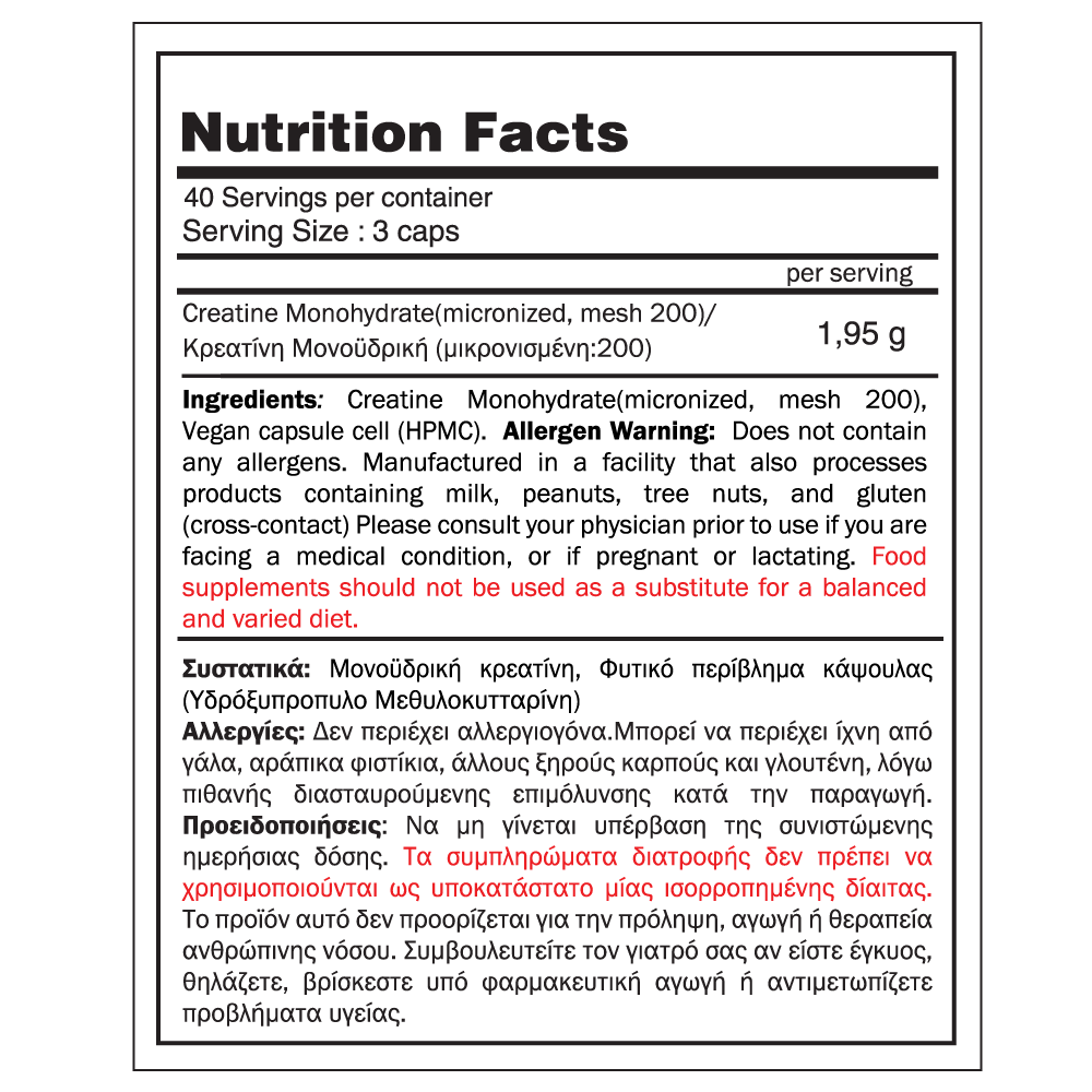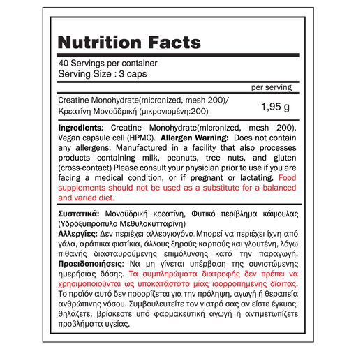 Σημ: Μην καταναλώνετε πολύ κοντά με καφέ ή άλλο ποτό που περιέχει καφεΐνη. Πίνετε λίγο χυμό ή καταναλώνετε μαζί με μια άλλη πηγή υδατανθράκων, προκειμένου να προωθήσετε την απορρόφηση κρεατίνης. Η μονοϋδρική κρεατίνη είναι κατάλληλη για χορτοφάγους και ανθρώπους που δεν καταναλώνουν αρκετό κρέας μέσω της διατροφής τους.