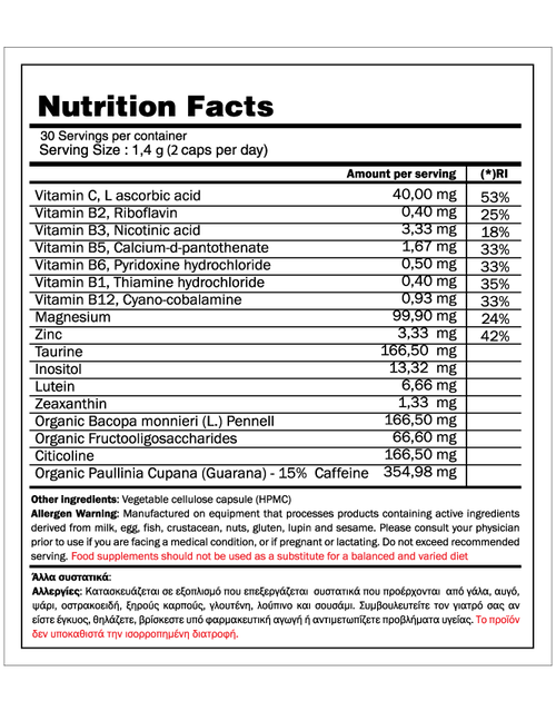 Περιέχει φυσικά συστατικά, όπως βιταμίνες, μέταλλα και ειδικά βότανα τα οποία συμβάλουν στη βελτιστοποίηση της πνευματικής σας απόδοσης. Συγκεκριμένα μπορεί να ενισχύσουν τη δυνατότητα σας να εστιάσετε και να μείνετε συγκεντρωμένος για περισσότερη ώρα. Επίσης παρέχουν ενέργεια στον εγκέφαλο και καταπολεμούν την πνευματική κόπωση. Τέλος βελτιώνει τη λειτουργία της μνήμης και συμβάλλει γενικά στην καλή υγεία του εγκεφάλου.